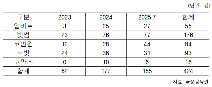 또한, 2020년부터 2025년 8월까지 디지털자산거래소 공동협의체(DAXA)공동 유의종목 지정 역시 빗썸에서 가장 많았던 것으로 나타났다. 거래소별 유의종목 지정건수는 △빗썸 37개, △코인원 28개, △업비트 14개, △코빗 12개, △고팍스 11개로 집계됐다. 유의종목 지정은 상장폐지 가능성이 높아 투자 판단에 각별한 주의가 요구되는 경우에 이뤄진다.