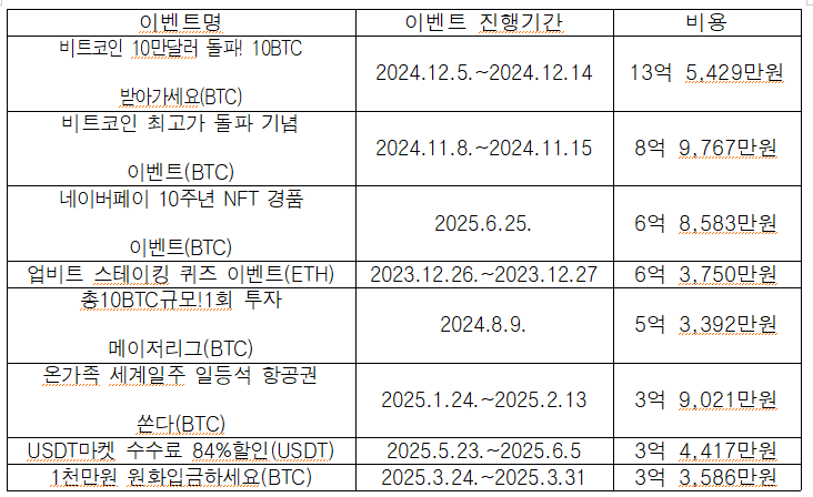이 같은 급성장 배경에는 대규모 이벤트 집행이 있었다. 빗썸은 고객 유치와 거래 활성화를 목적으로 수수료 인하, 리워드(페이백) 등 각종 이벤트를 지속적으로 진행해왔다. 2023년부터 2025년 7월까지 총 176회의 이벤트에 1,803억 원을 집행한 것으로 확인됐다.