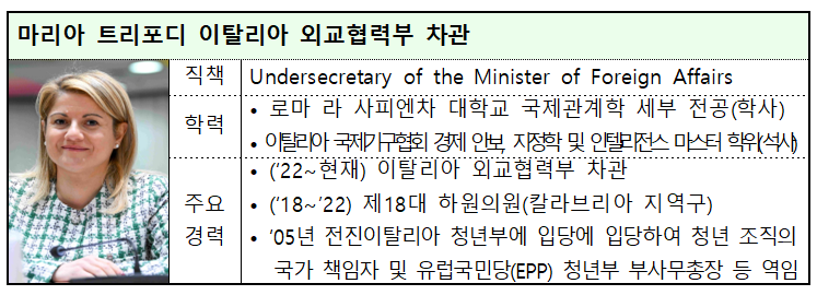 기후에너지환경부(장관 김성환)는 2월 11일 오전 달개비(서울 중구 소재)에서 이호현 기후에너지환경부 제2차관과 마리아 트리포디(Maria Tripodi) 이탈리아 외교협력부 차관이 면담을 갖는다고 밝혔다.