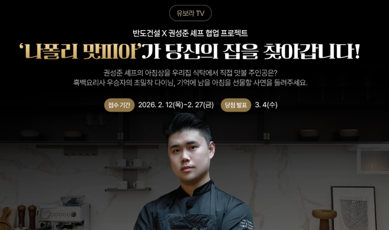 당첨자 발표는 2026년 3월 4일(수) 진행될 예정이다. 최종 선정된 가족은 자택에서 권성준 셰프와 함께 아침 요리 촬영을 진행하며, 촬영본은 유튜브 ‘유보라TV’에 업로드 될 계획이다. 또한 참여자 중 50명을 추첨해 스타벅스 기프티콘을 제공한다.