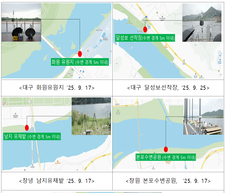이번 조사는 2025년 9월 15일부터 25일까지 낙동강 본류 구간 녹조 심화지역 5개(① 화원유원지(대구 달성군 일원), ② 달성보선착장(대구 달성군 일원), ③ 본포수변공원(경남 창원시 일원), ④ 남지유채밭(경남 창녕군 일원), ⑤ 대동선착장(경남 김해시 일원) ) 지점 (수변경계로부터 5m이내 시료채취)에서 총 20회(각 지점당 4회) 실시했으며, 국립환경과학원( 국립환경과학원의 공기중 조류독소 분석은 한국과학기술연구원(도핑콘트롤센터)에서 수행 ) 및 경북대학교 연구진이 원수와 공기중 조류독소 6종( 마이크로시스틴(Microcystin)은 유해남조류가 생성하는 대표적인 독소물질로 6종은 -LR, -YR, -RR, -LA, -LY, -LF(마이크로시스틴의 종류를 구분하기 위한 아미노산 명칭)을 말함 )을 측정했다.