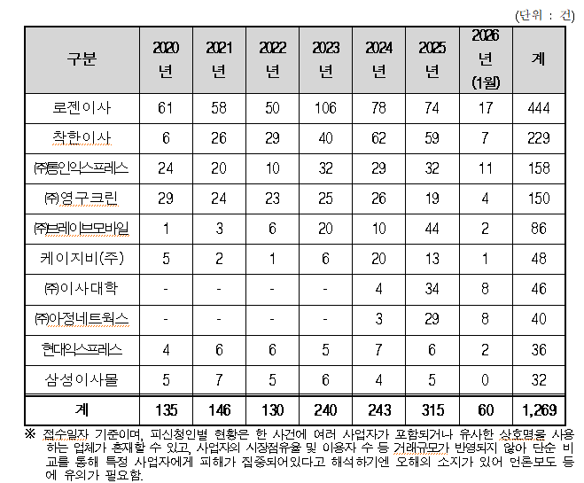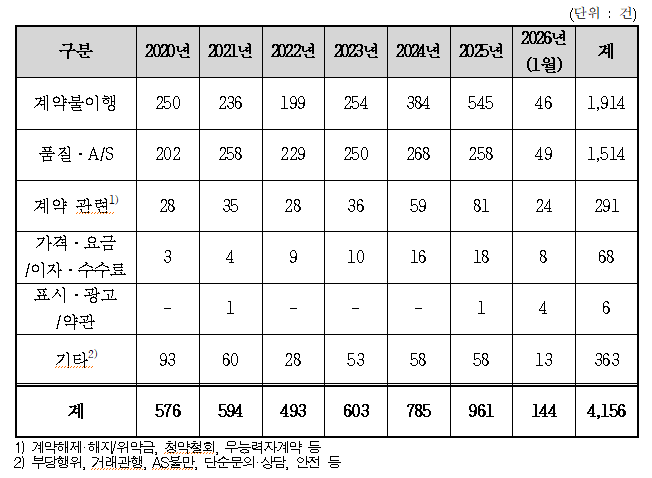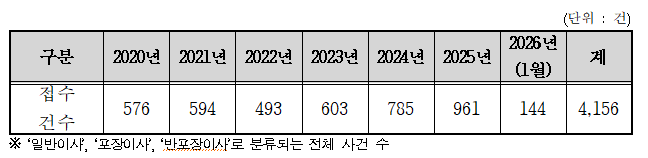 이를 연도별로 살펴보면 △2020년 576건, △2021년 594건, △2022년 493건, △2023년 603건, △2024년 785건, △2025년 961건, △2026년 1월 144건으로 집계됐다.
