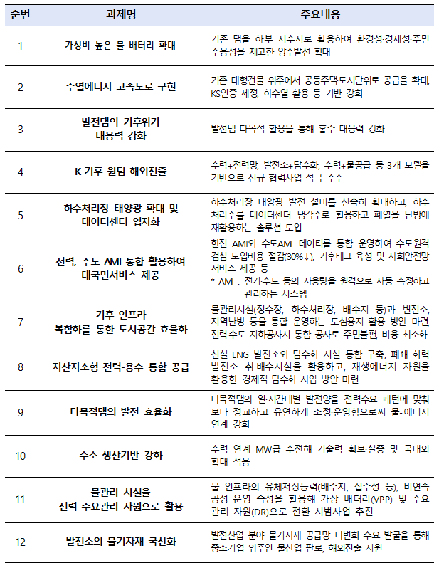 물-에너지 융합 포럼은 출범과 동시에 물·에너지 기능을 융합하는 12개 과제를 선정해 논의를 시작한다. 주요 과제로는 ▲기존 댐을 하부 저수지로 활용하여 환경영향과 비용·기간을 최소화하며 양수발전을 확충하는 가성비 높은 물 배터리 확대, ▲기존 대형건물 위주에서 공동주택·도시단위로 공급을 확대하는 수열에너지 고속도로 구현, ▲수력발전과 전력망 연계 사업의 해외 동반 수주를 위한 K-기후 원팀 해외진출 등이 있다.