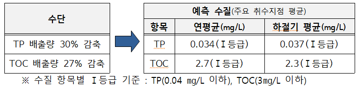 이번 대책이 차질 없이 이행될 경우, 낙동강 본류 주요 취수지점의 총인과 총유기탄소를 Ⅰ등급 수준(총인 0.04mg/L이하, 총유기탄소 4mg/L이하)으로 개선하는 한편, 산업폐수에 대한 주민 우려도 상당 부분 완화될 것으로 기대된다.