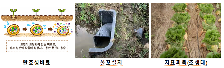 또한 완효성비료(완효성비료: 작물의 생육 기간에 맞추어 비료 성분이 서서히 방출되도록 설계된 비료 ) 사용을 확대하여 토양 내 잔류 양분을 줄이고, 논 물꼬조절장치 보급 등 최적관리기법(BMPs: 농업활동에서 발생하는 오염물질을 최소화하기 위해 과학적 분석에 기반하여 비료‧토양‧수자원 등을 적정 수준으로 관리하는 표준화된 관리기법) 을 확산한다.