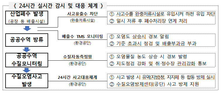 또한, 수질오염사고를 예방하기 위해 24시간 실시간 감시체계를 강화한다. 현재 낙동강 수계 폐수의 약 96%는 최종 방류구에 부착된 수질원격자동측정체계(수질 TMS)를 통해 실시간 감시중이며, 그 하류 하천(공공수역)에는 수질자동측정망이 설치되어 있어 수질에 이상이 발생 시 즉각 경보를 발령한다.
