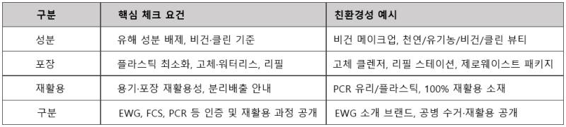 특히 플라스틱 최소화(고체/워터리스)하고, 리필·재활용 용기, 친환경 인증(예: EWG, FCS, PCR 소재) 등을 확인하면 환경 부담을 줄이는 선택에 가까워집니다.