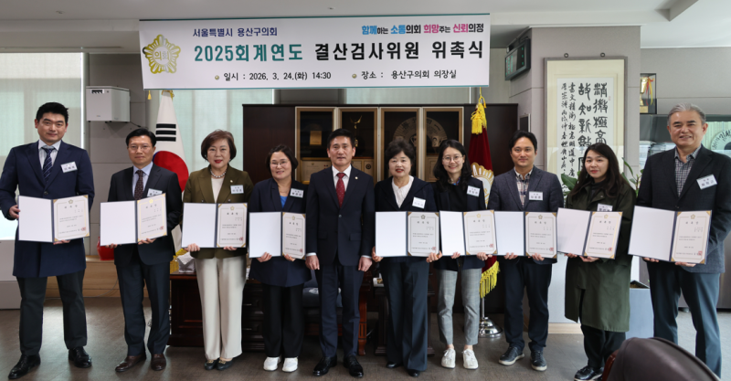 2025회계연도 결산검사위원은 총 9명으로, 이미재(대표위원)·황금선·이인호 용산구의원 3명과 재정·회계 분야의 전문 지식과 풍부한 경험을 갖춘 정선화 회계사, 임광준·이재욱·유일한·홍대성 세무사, 최혁균 전 용산구 행정지원국장이 민간위원으로 위촉됐다.
