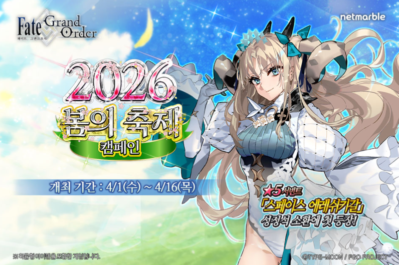 넷마블이 모바일 RPG <페이트/그랜드 오더(Fate/Grand Order)> '2026 봄의 축제 캠페인'을 통해 이용자들에게 풍성한 혜택을 증정한다고 최근공시를 통해 밝혔다.