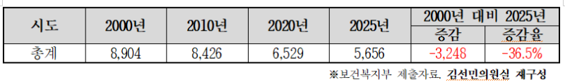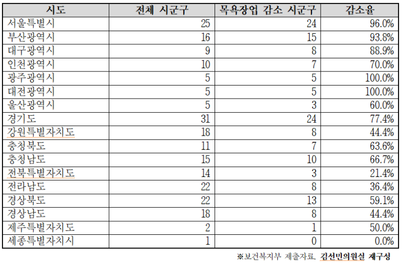 실제 보건복지부에 따르면, 2025년 기준 공중위생업소 중 목욕장업은 5,656개소로 2000년 8,904개소 대비 36.5%인 3,248개소가 감소한 상황이다.