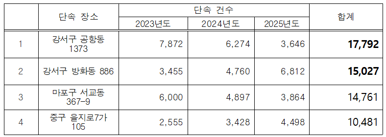 이처럼 전체적으로는 단속 강도가 완화되는 흐름을 보이고 있음에도 불구하고, 강서구 공항동 1373과 방화동 886 등 김포공항 내부 도로에 설치되어 있는 고정형 CCTV 8개소에서는 최근 3년간 총 3만 2,819건의 단속이 발생한 것으로 나타났는데, 이는 1개소 기준으로 환산하면 약 1,367건으로, 서울시 평균(137건) 대비 약 10배 이상 높은 수준이다.