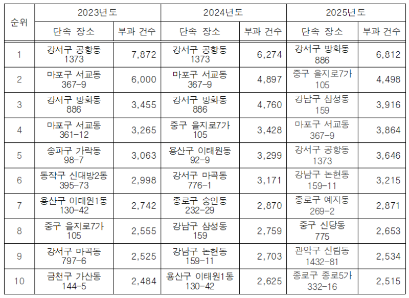 또한 3년 연속 불법주정차 과태료 단속 상위 구간인 서교동과 을지로7가 역시, 상권 밀집에 따른 상시 승하차 수요와 협소한 도로 구조로 단속이 집중되는 양상을 보이고 있어, 근본적인 개선 대책 마련이 시급하다.